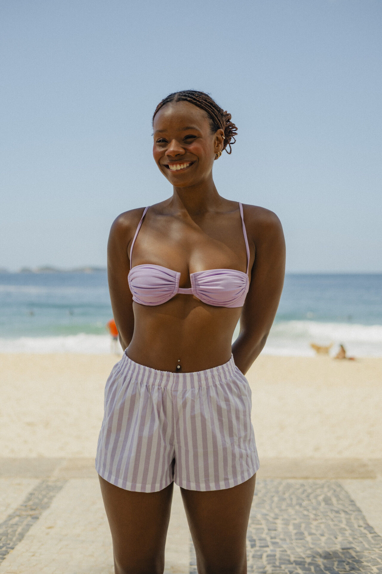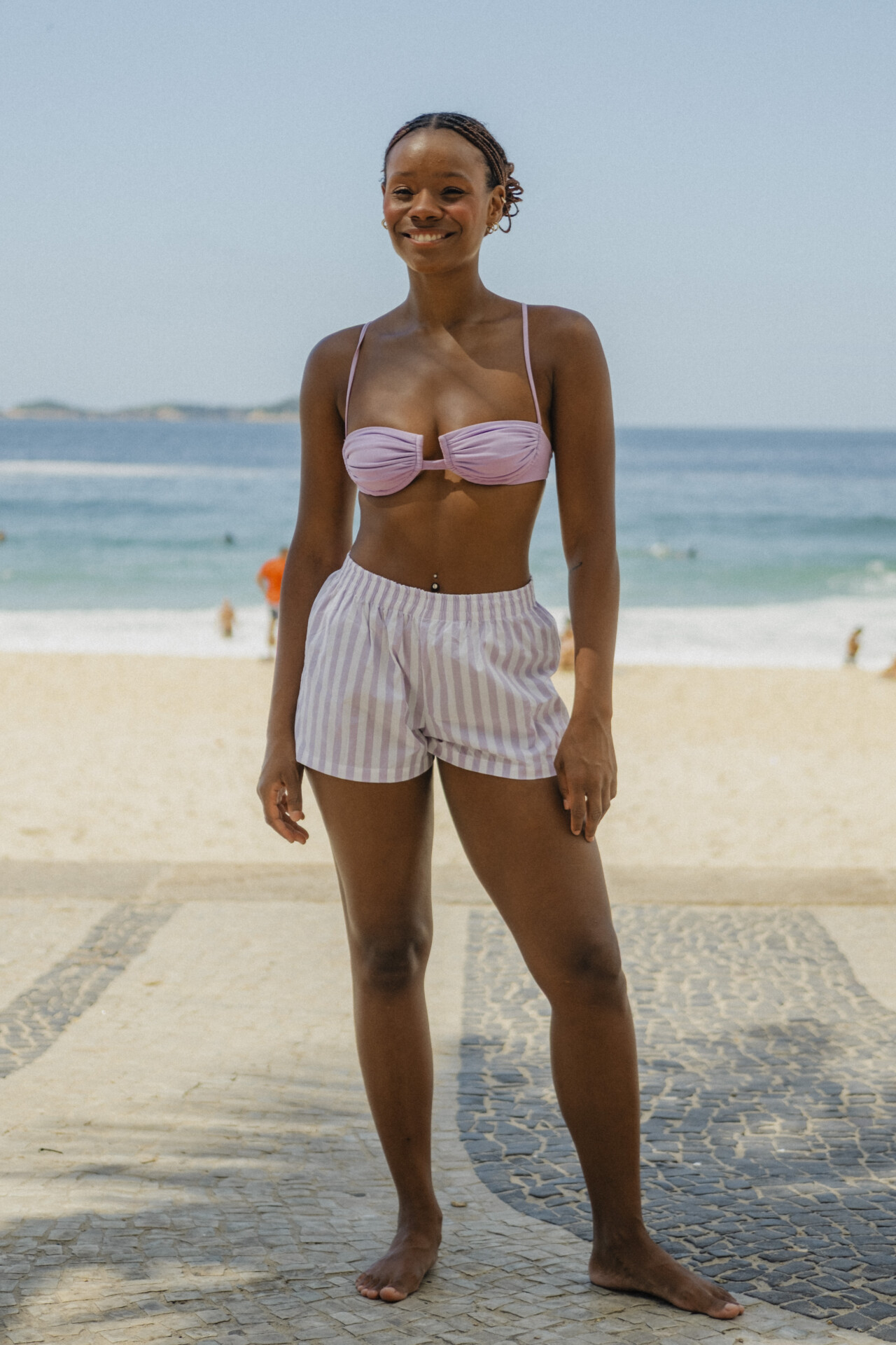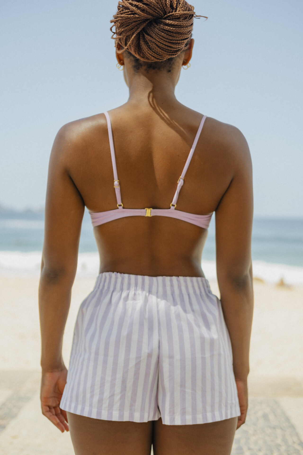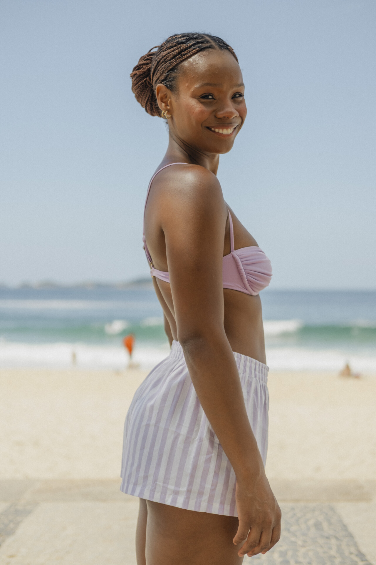 O Short Listrado é aquela peça prática e estilosa que combina com tudo. Ele é mais curtinho, tem elástico na cintura e modelagem retinha que deixa o look leve e confortável. Fresco, versátil e perfeito pra usar com a bata combinando ou montando looks separadas.