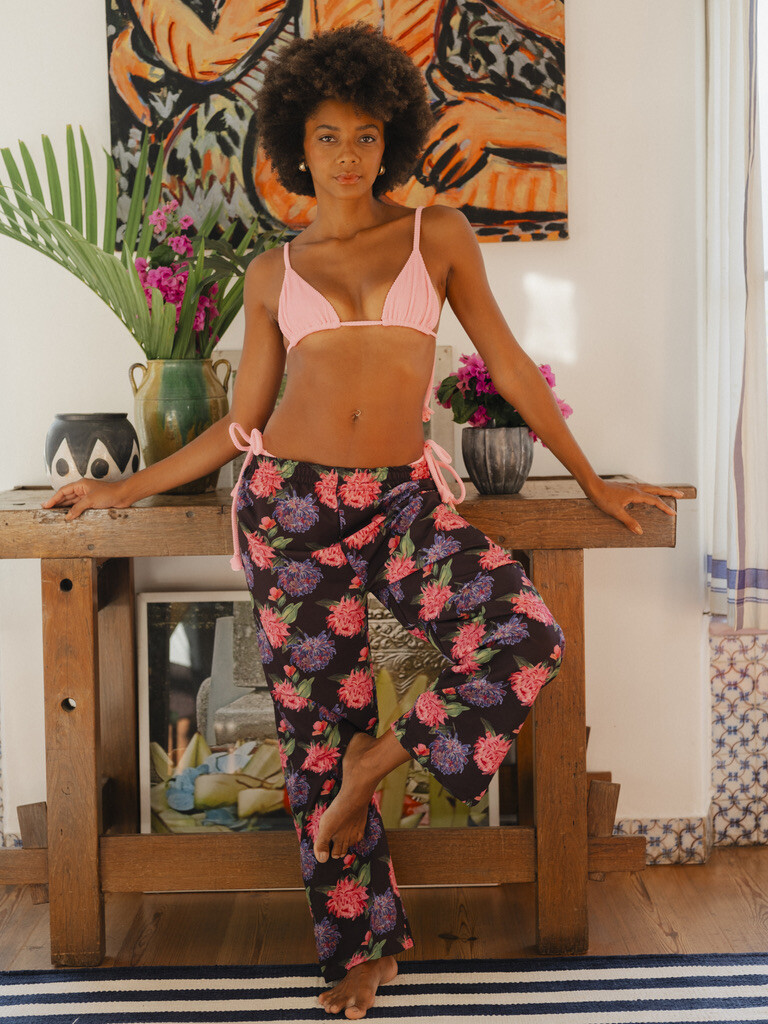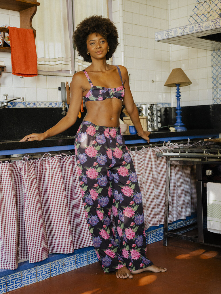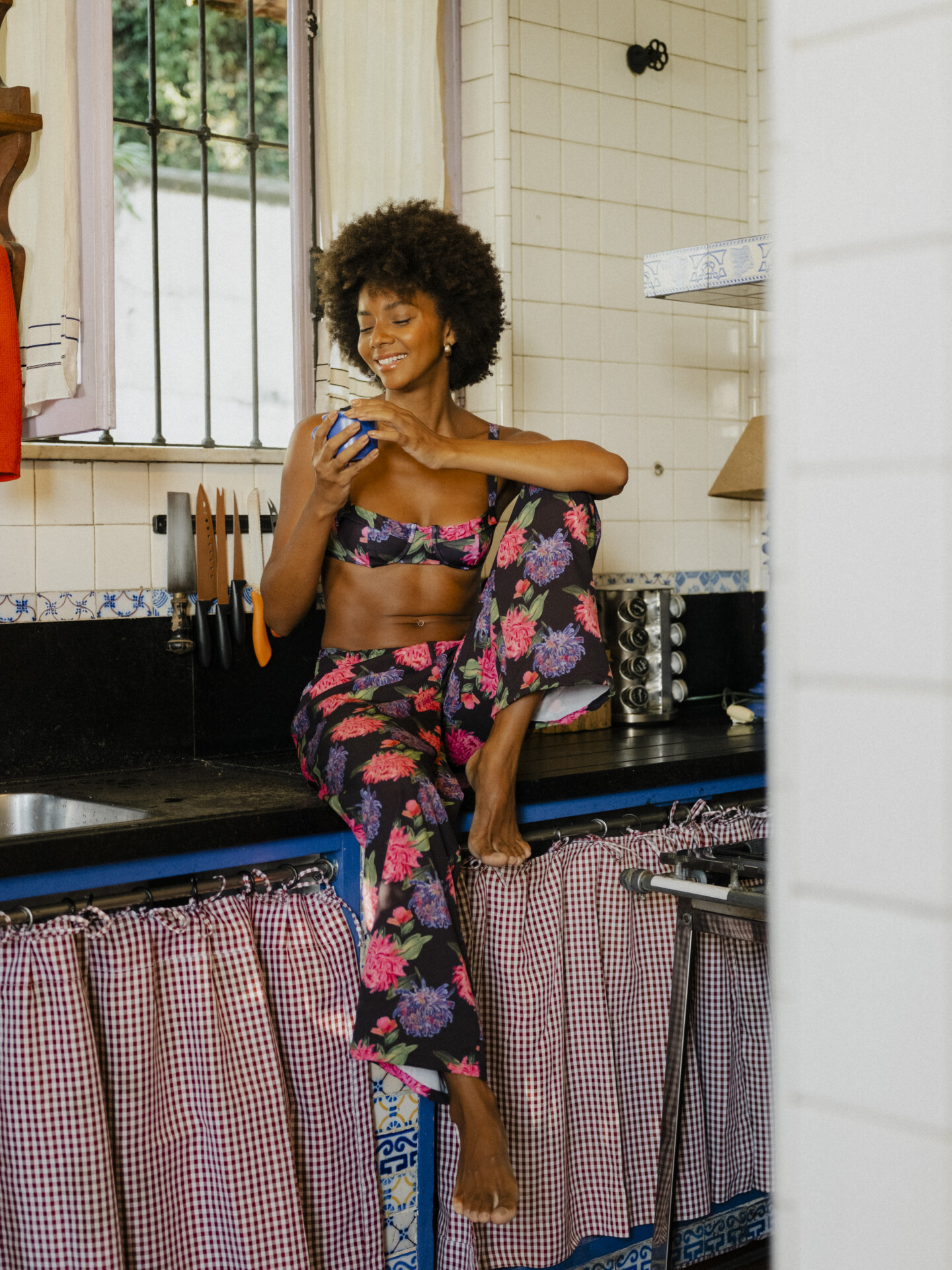 A nossa calça é perfeita pros dias quentes e pra compor seus looks. Ela tem a modelagem reta, soltinha no corpo e com elástico na cintura e o tecido é super leve. Para usar ela mais cintura baixa só escolher um tamanho acima do seu.