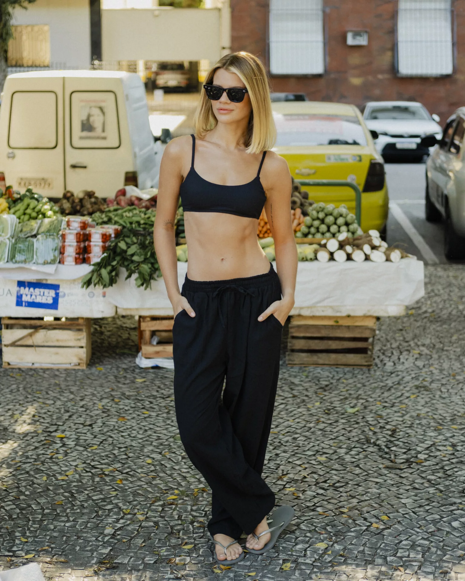 A nossa calça que é perfeita pros dias de verão. Ela tem modelagem soltinha na perna, elástico na cintura com amarração ajustável e bolsos laterais que deixam o look ainda mais cool. O tecido é super leve e gostoso, e sua modelagem oversized traz mais conforto pro dia a dia.