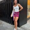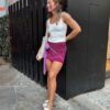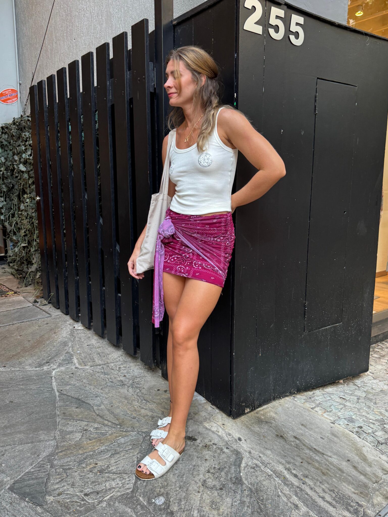 A nossa saia é aquela peça versátil que a gente ama, vai do look da praia pro look da noite. Ela é coladinha no corpo, com tecido de tule. A amarração lateral dá um charme extra. Ela dá para usar também como uma blusa.